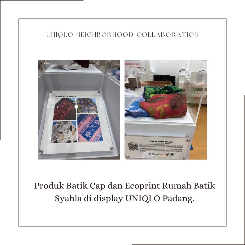 Kini, kamu bisa melihat langsung karya Rumah Batik Syahla di UNIQLO SME Corner – Basko City Mall Padang, bersama karya inspiratif lima UMKM Padang lainnya.